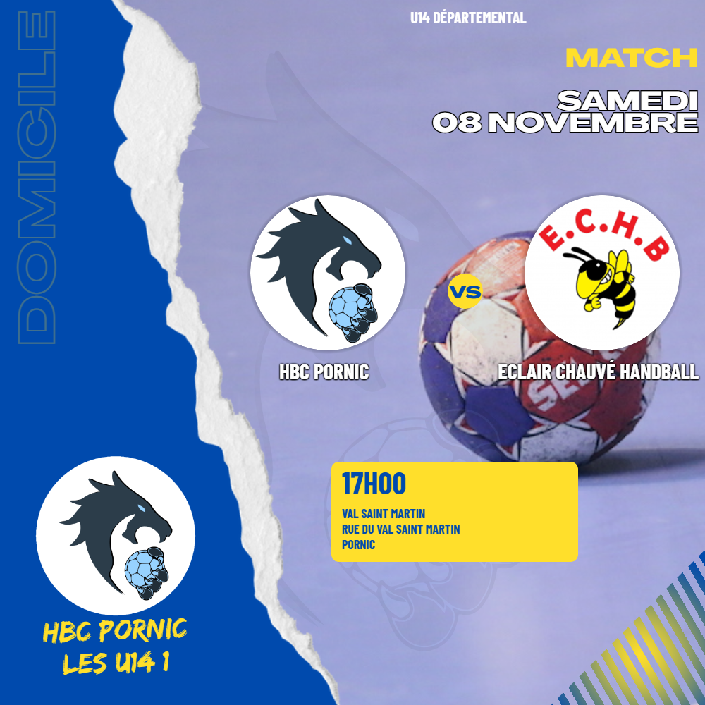 • HBC Pornic U14 (1)HBC Pornic U14 (1)/Eclair Chauvé HandBallEclair Chauvé HandBall Les U14 (1) reçoivent l' Eclair Chauvé HandBall à 17h00