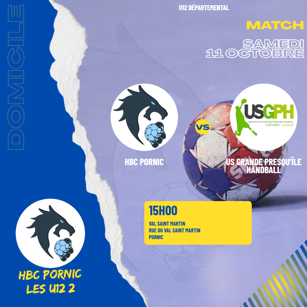 • HBC Pornic U12 (2)HBC Pornic U12 (2)/US Grande Presqu'île HandballUS Grande Presqu'île Handball Les U12 (2) reçoivent l' US Grande Presqu'île Handball à 15h00