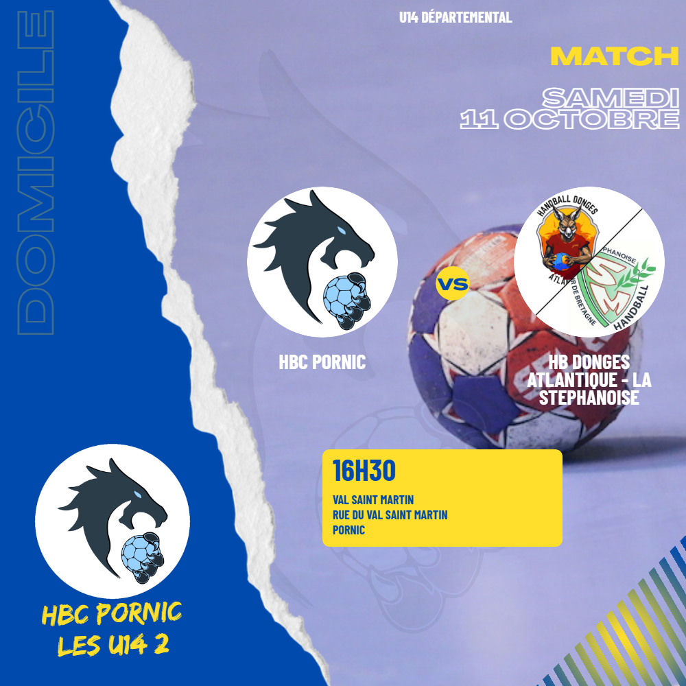 • HBC Pornic U14 (2)HBC Pornic U14 (2)/HB Donges Atlantique - La StephanoiseHB Donges Atlantique - La Stephanoise Les U14 (2) reçoivent le HB Donges Atlantique - La Stephanoise à 16h30