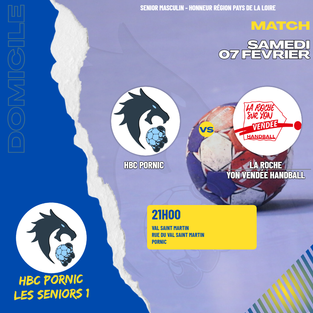 • HBC Pornic SM1HBC Pornic SM1/La Roche/Yon Vendée HandballLa Roche/Yon Vendée Handball Les Seniors 1 reçoivent La Roche/Yon Vendée Handball à 21h00